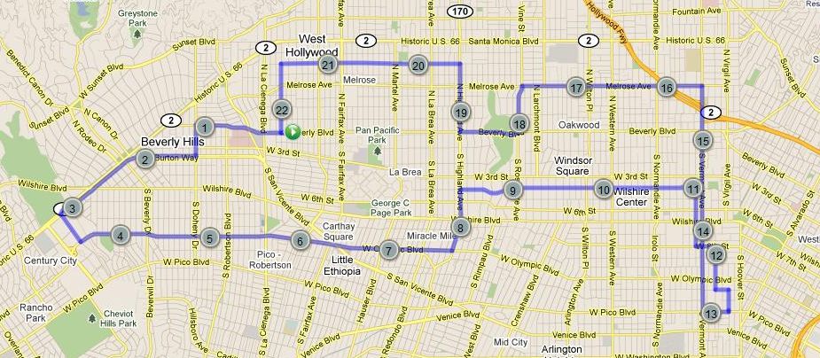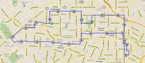 The training ride began at I.Martin and we started off by heading west toward Beverly Hills and then down toward Century City. At Olympic Boulevard, we turned and headed east. Normally, Olympic is a pretty busy street, especially during commuting hours, but it was still pretty early on Sunday so traffic wasn’t too bad. We passed the Miracle Mile section and turned north on Highland Avenue. We soon turned east again onto 4th Street, which has painted arrows and bicycle icons called “Sharrows,” indicating that bikes and cars are supposed to share the road. We were on 4th Street for about two and a half miles, but it felt like forever. There were stop signs at every block and since bikes have to follow the rules of the road, we had to stop at ever stop sign. That got annoying after the third stop sign. Argh!