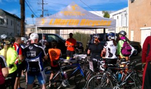 Shifting Gears led riders on a unique training ride around Los Angeles, dubbed the “Urban Ride.” The route was created by Chris, one of the training ride leaders, and it was designed to take riders through some of the busy streets of Los Angeles so we can learn to ride and commute in traffic. I.Martin’s store manager, Jaime, and sales supervisor, Matt, joined us for the ride. Chris and Matt kicked things off by talking about key things to look out for when riding and commuting in Los Angeles. They shared riding tips and important lessons they have learned. For example, in order to stay clear of car drivers’ doors opening in your path, ride more toward the car lane than the parked cars and anticipate doors opening by watching through the cars’ rear windows as you approach from behind. It was a very helpful talk.