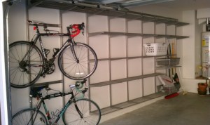 Sam and I purchased a brand new Elfa shelving system for the garage where we can now hang up our bikes. We had wanted to get some kind of a bike rack and took advantage of the Elfa sale at the Container Store. Actually, we had been thinking of adding shelving in the garage for a while, so this just killed two birds with one stone.