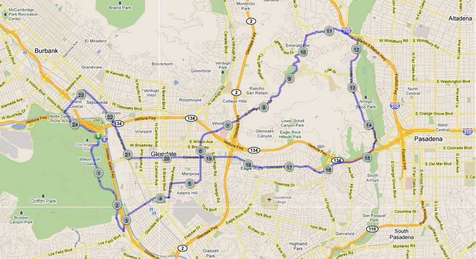 Riding to Pasadena was rather nice. We were riding near the Rose Bowl and picked up some downhill speed on the way. Once we reached the southern end of Pasadena, we rode west to Glendale through Eagle Rock. It was a roughly six-mile ride from Pasadena to the western end of Glendale. Fortunately, it was on a flat stretch so we got through fairly quickly. Soon, we were back in Griffith Park and made our way back to the zoo. To my surprise, we still rode a respectable total of 24.67 miles even though we cut our ride short. It was when we got back to our car that I realized that this was the first ride I had done where I rode from beginning to end without resting at a pit stop. It’s a bit unusual to ride that long without a break to use the restroom and refill on water and snacks. I don’t plan on making a habit of this since I really needed to go to the restroom. Sorry for over-sharing. Oops!