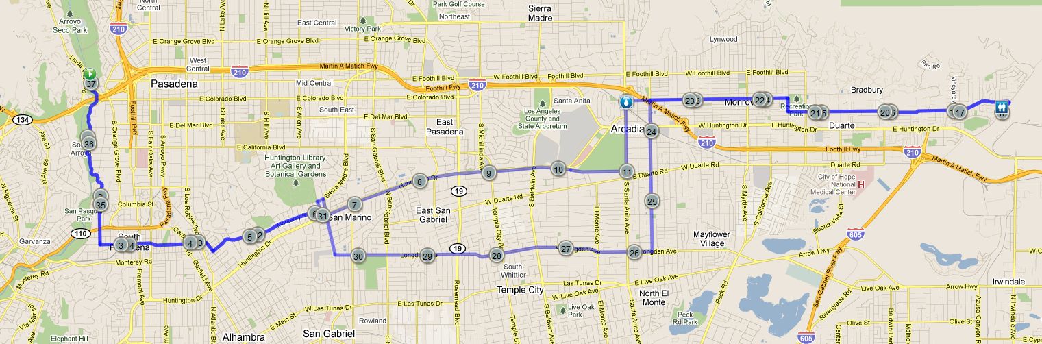 After the llama break, it was time to head back. The route back was mostly the same, except we also rode through Temple City and San Gabriel. The entire ride was mostly flat. I didn’t realize there were no hills until we got back. Still, even though the terrain was flat, I was totally winded and exhausted. I was so happy to be done when we got back to the Rose Bowl. Total miles was 37.10.