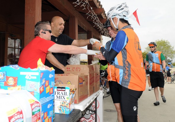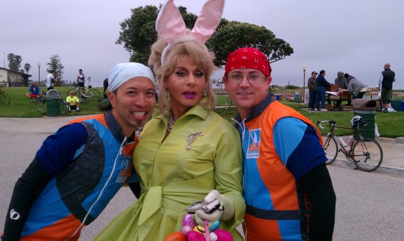 The third leg took us all the way to the beach in Ventura. I didn’t care for this section at all. I was a little bored and perhaps it was because the surrounding area was less visually stimulating than the previous leg with the orange groves. Plus, I was starting to get tired. I felt like I was slowing down and struggled to keep up with Sam. I was ready for a break when we reached Marina Park, our lunch pit stop. As we were riding into the park, the first person I saw was Ginger Brewley. Ginger is a drag diva superstar who is one of AIDS/LifeCycle’s strongest supporters. Ginger has volunteered her time and energy on many AIDS/LifeCycle rides to cheer on riders. When I did AIDS/LifeCycle in 2003, I remember Ginger was always at the top of the toughest hills and at the most opportune spot when I most needed a spirit-boaster. Ginger is awesome. I did not know that Ginger was going to be at this century ride, so I was so happy to see a friendly face cheering us into our lunch stop. (Thanks Ginger!)