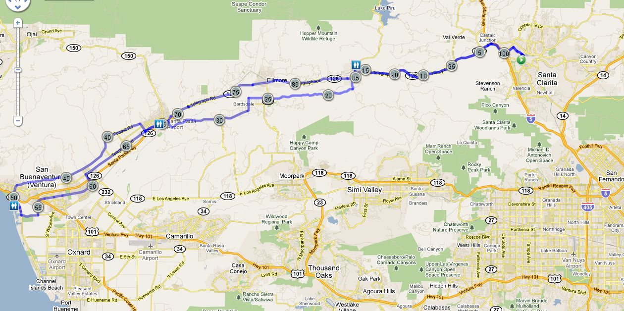 After a heartfelt welcome by a member of Positive Pedalers, followed by the oh-so-important usual safety speech, we took off a little after 7 am. The ride headed west, mostly along Highway 126. The plan was to ride to the beach in Ventura and then back, roughly 50 miles each way. There were going to be five pit stops, including lunch along the way at the half-way point. So we would ride about 15-20 miles on each leg and then get a break at the pit stops. The century almost sounded easily doable.