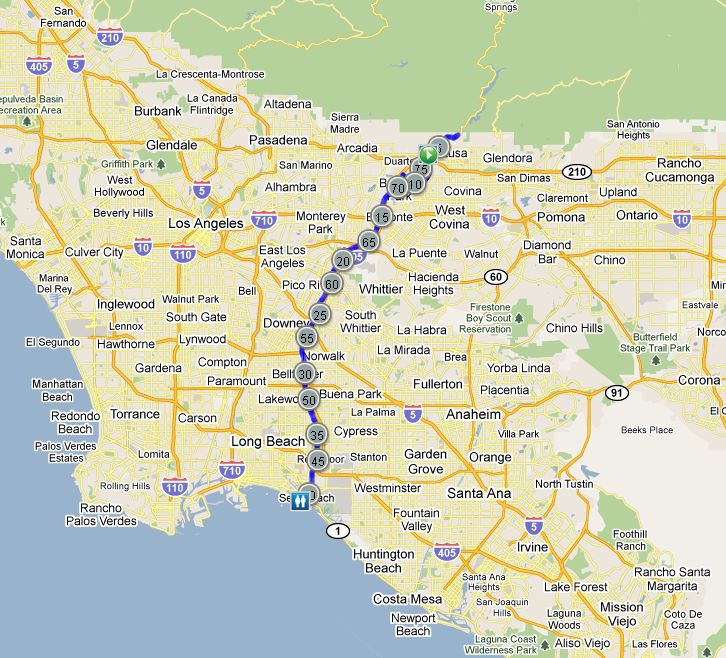 The trail starts just north of Azusa and ends in Seal Beach. The round-trip loop is just under 80 miles – for us, it was 76.08 miles to be exact. The trail mostly follows the San Gabriel River and the 605 freeway. We rode past the Santa Fe Dam pretty early on in the day and there were some mini-dams along the way which was cool. Oh! There’s also a horse trail alongside the bike trail, so we saw people riding horses along the way. We ended up riding the entire way down to Seal Beach without stopping – all 40 miles. Along the way, we passed Irwindale, Baldwin Park, El Monte, Pico Rivera, Whittier, Downey, Norwalk, Bellflower, Cerritos, Lakewood, Cyrpess and Long Beach. The way down took just under three hours. It was the longest I’ve ever ridden without stopping.