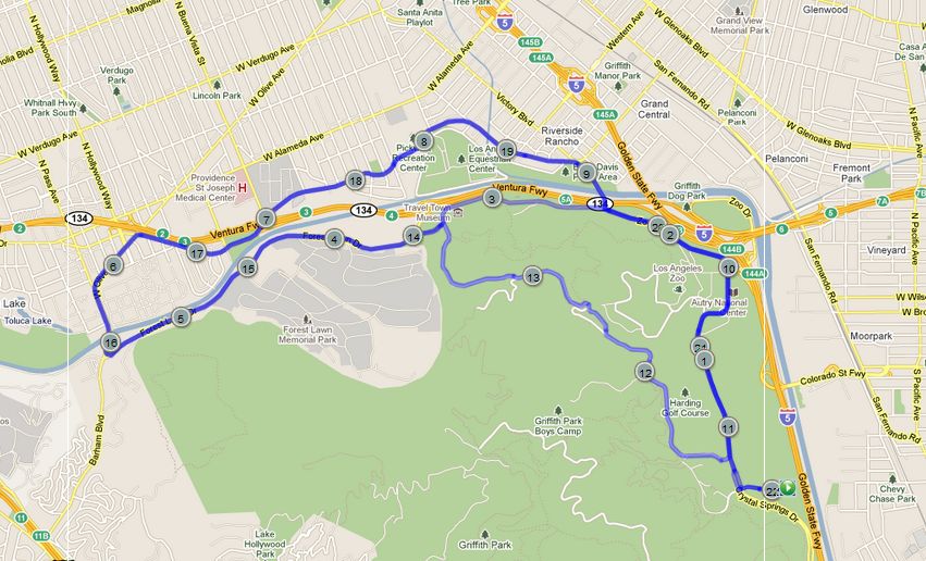 The ride was short – only 22.07 miles. We started in Griffith Park and rode west along the north border of Griffith Park past Forest Lawn Memorial Park. We circled around the studios in Burbank and headed back down to Griffith Park. Then we turned onto Griffith Park Drive and climbed what most people call the “Garbage Hill”. It was given the name because there used to be a landfill there. It’s rather shocking to learn that there once was a landfill in this beautiful park. I didn’t see any garbage, landfill or Jake Gyllenhaal (who’s known to ride this hill), but the scenery was breathtaking. On top of that, we had great weather, just perfect for riding. It almost made the climb effortless. But honestly, it really wasn’t that bad of a climb. Maybe all that training is finally paying off. After our descent, we repeated the loop around Burbank and returned to Griffith Park.